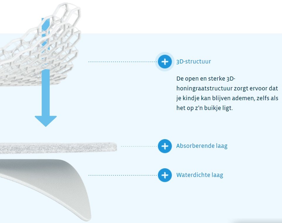 Deze matrasbeschermer bestaat uit een open 3D-honingraatstructuur, waar