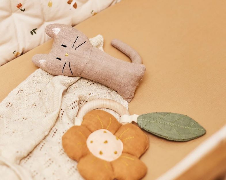 Deze kleine bloemenbijtring spreekt recht tot het hart met delicate, handgeborduurde details en mooie douchekleuren die er geweldig uit zullen zien in elk klein universum. De bloem heeft een belletje aan de binnenkant, terwijl het blad gekreukeld papier heeft om de zintuigen van het kind te stimuleren.