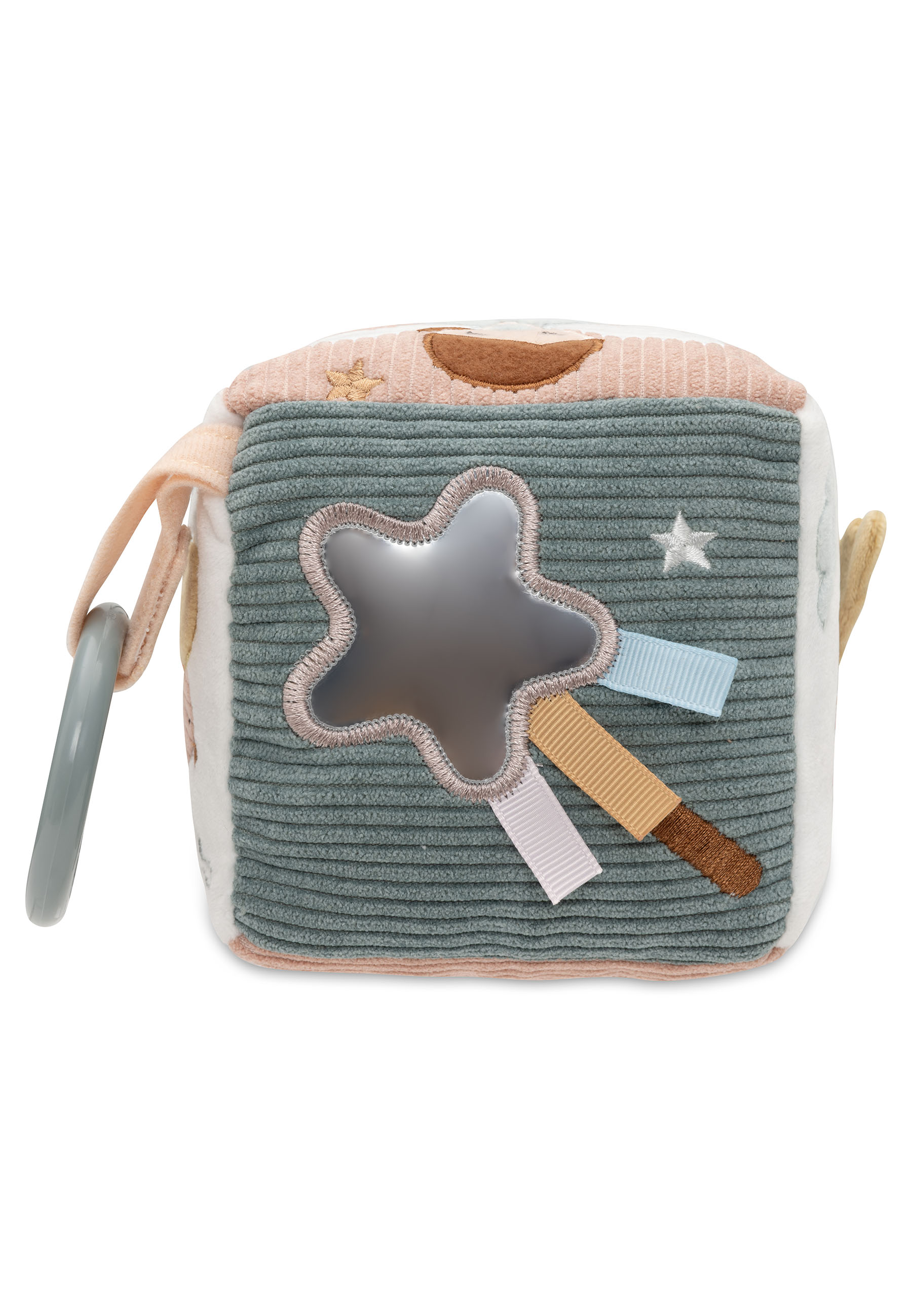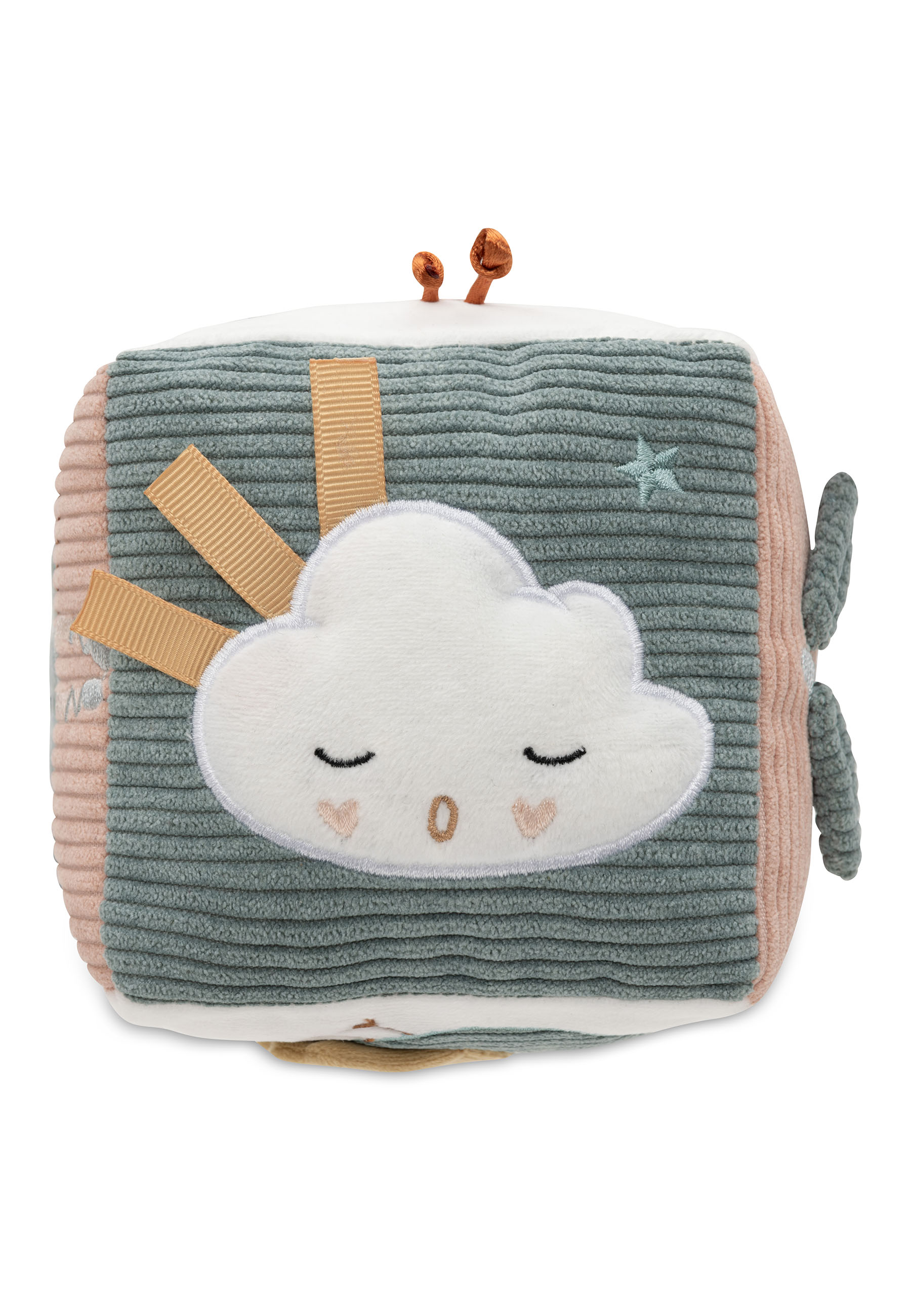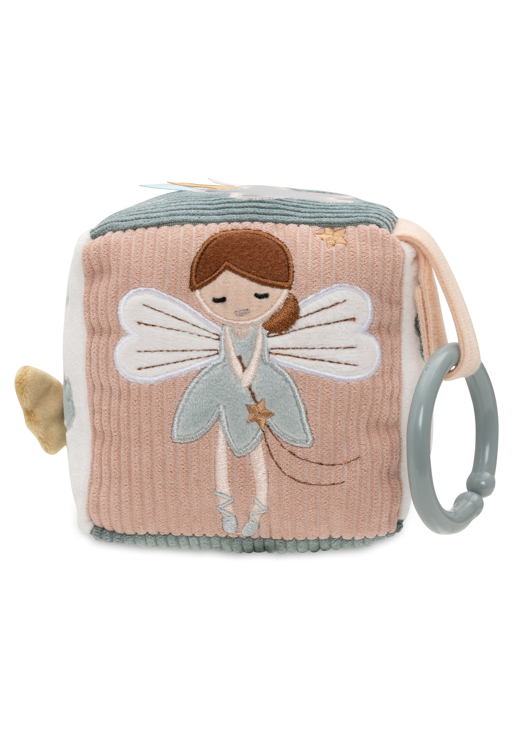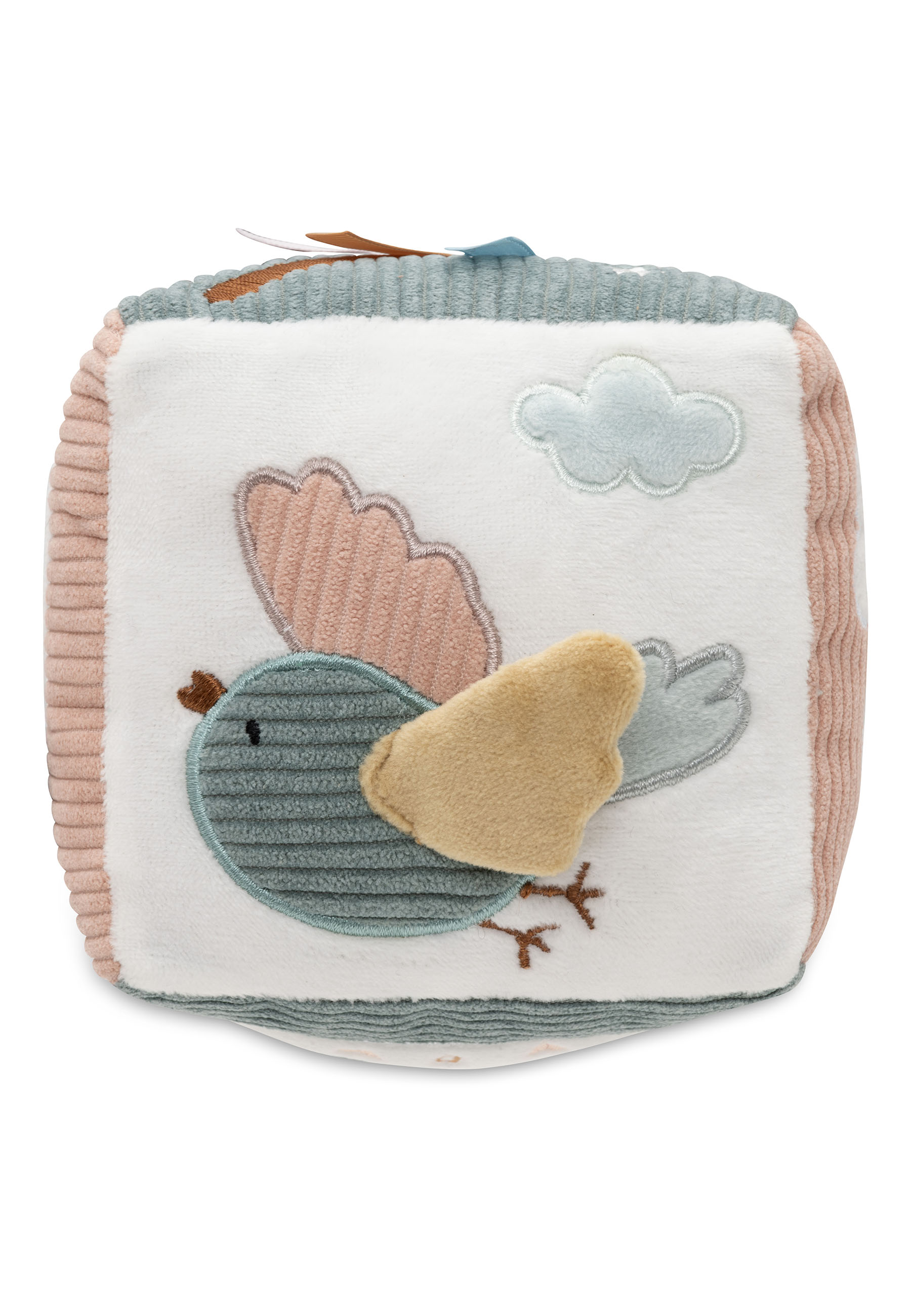 Deze vrolijke activiteitenkubus in het Lovely Birds-thema zit vol met kleurrijke opdrukjes, schattige printjes, leuke tags en mooie borduursels! Je vindt er vrolijke vogeltjes, fluffy wolkjes, bloemen, een ster, en zelfs fairy Amy komt voorbij! De vogels hebben schattige vleugeltjes, en de koordjes zijn prachtig geborduurd, zodat je kleintje eindeloos kan spelen en ontdekken.