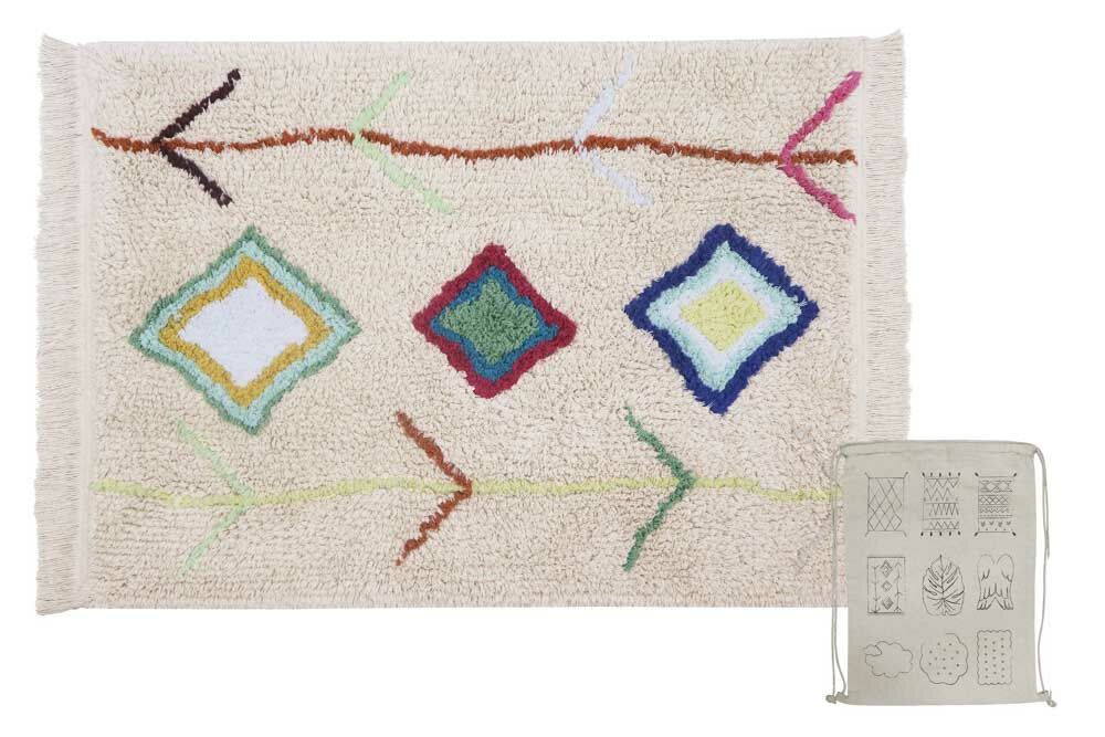 Ons populaire Kaarol vloerkleed, nu in een nieuw handzaam formaat. Rechthoekig wasbaar minitapijt in natuurlijke kleur, met etnisch geïnspireerde symbolen in contrasterende felle kleuren. Afgewerkt met natuurlijke kleur franjes aan de randen. Wordt geleverd met een praktische nettas.