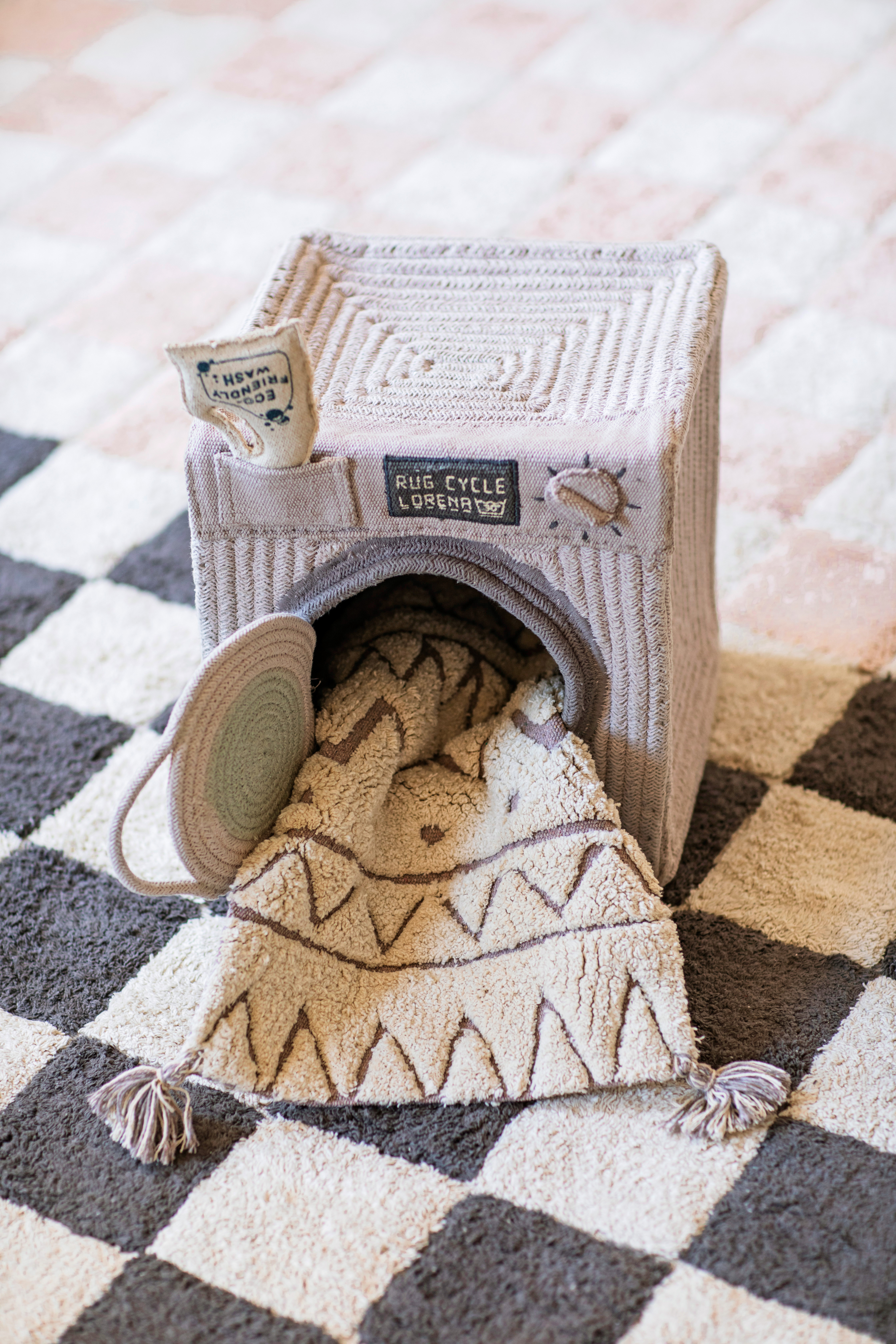 Het Kitchen Tiles vloerkleed is geïnspireerd op vintage keramische vloeren en heeft een geruit patroon dat speelt met contrasterende natuurlijke en donkergrijze kleuren. Het vloerkleed gebruikte onze RugCycled mix / Natural canvas basis, waarbij de basis iets zichtbaar bleef tussen de gekleurde vierkanten die de keukentegels simuleren.