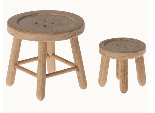 Een kruk- en tafelset gemaakt voor de muizenfamilie. Het is geïnspireerd op knopen en kan worden gecombineerd met andere muizenmeubels en accessoires om een ??prachtig huis te creëren. Hij past perfect in de Muizenholboerderij.
