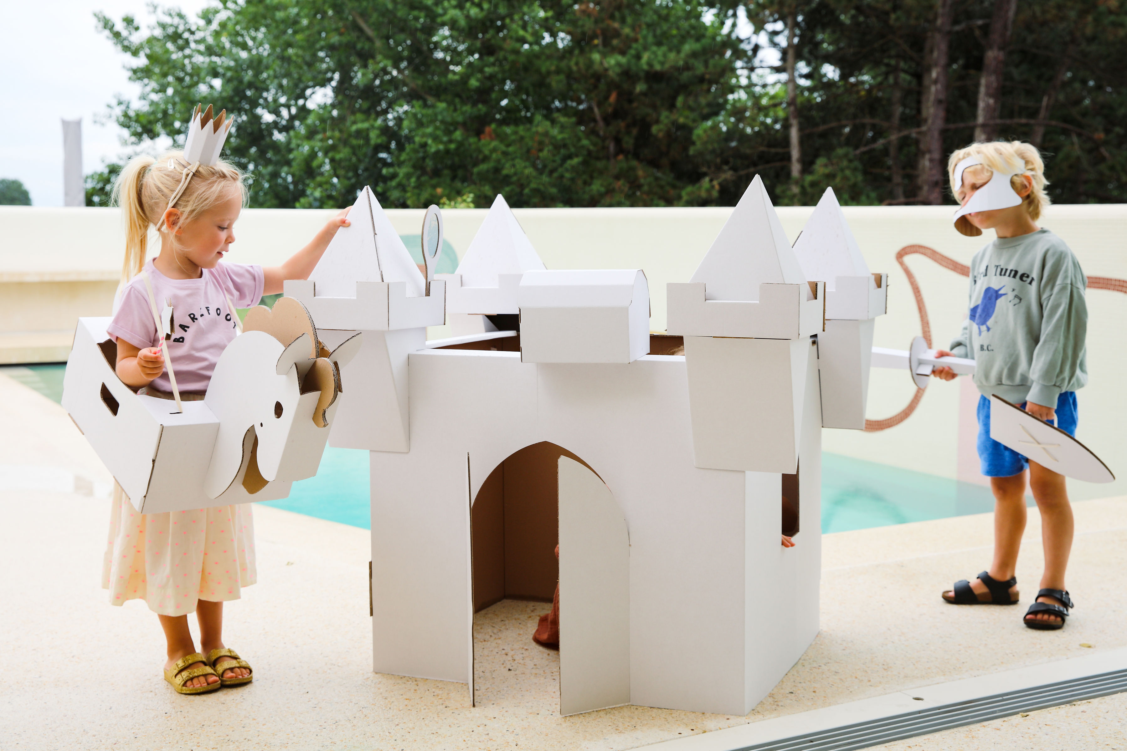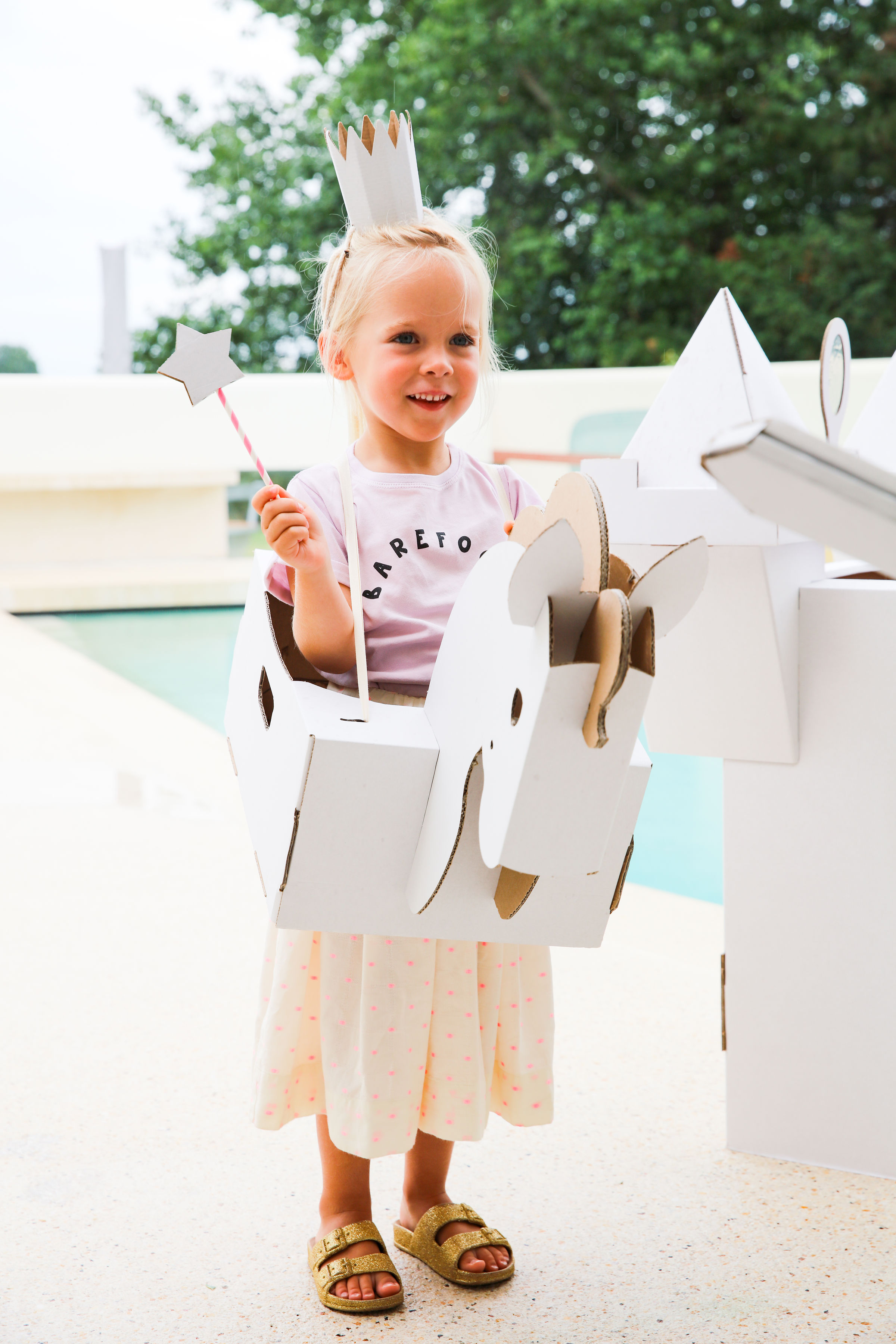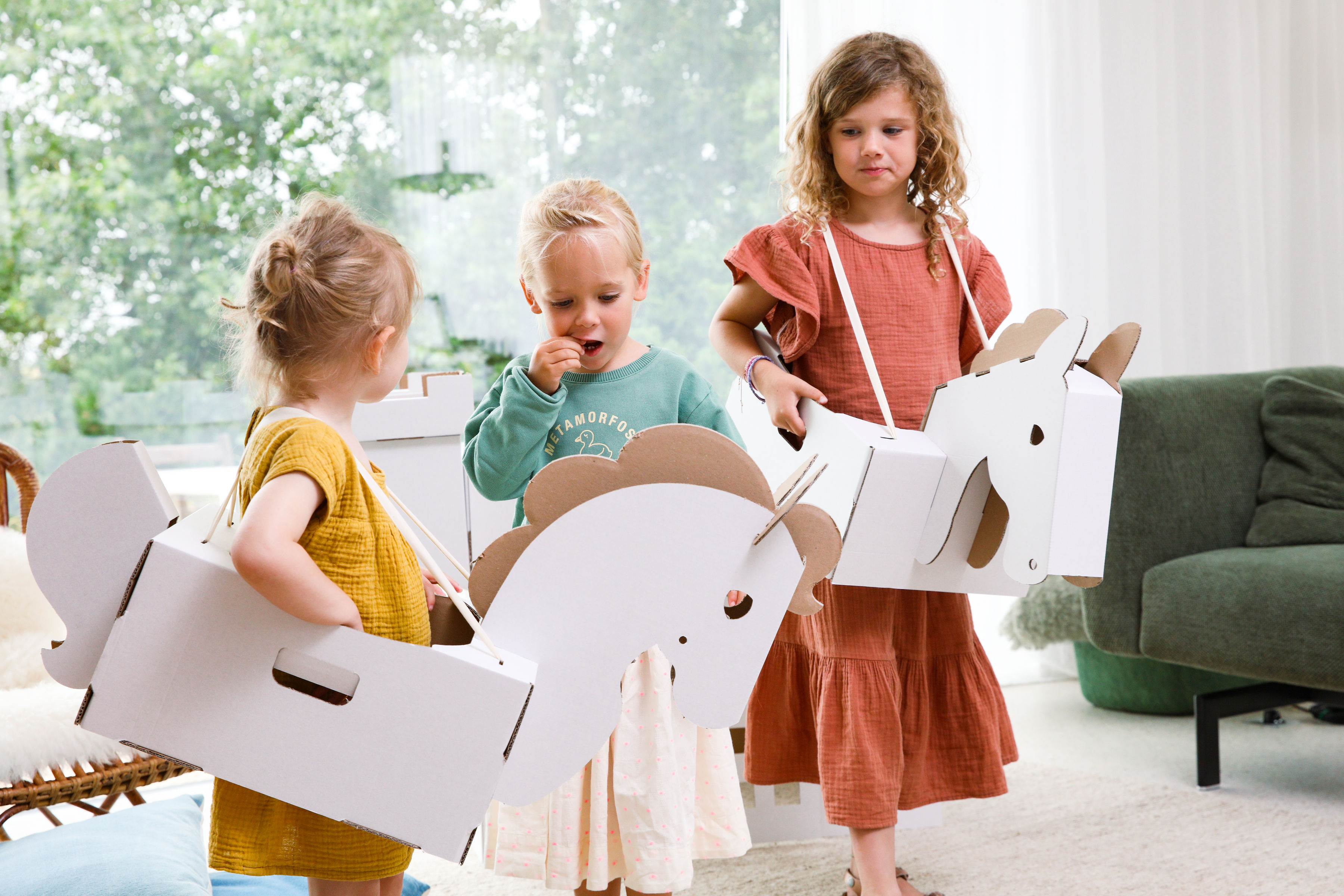 Klik klak, dat is het geluid van paarden die voorbij komen. Ga op reis naar een ver land, rijd met je vrienden naar prachtige zonsondergangen. Doe het allemaal in je schattige kartonnen paardenkostuum