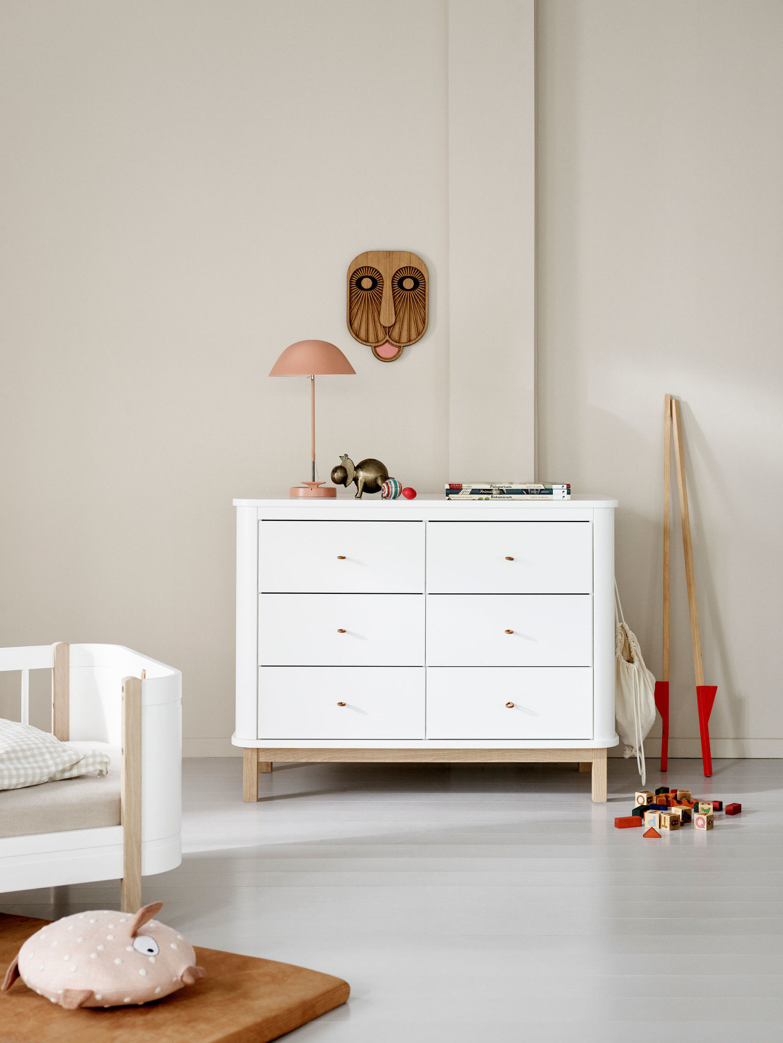 De commode en de aankleedplanken zijn voorzien van ronde hoeken. Dat ziet er niet alleen mooi uit maar zorgt ook voor een stukje extra veiligheid in de baby- en kinderkamer. Daarnaast zijn de lades voorzien van een soft-close-systeem zodat vingertjes er niet ongemerkt tussen bekneld kunnen raken. Grappig maar ook slim zijn de verborgen ophangknoppen aan de beide zijkanten van de commode. Daar kun je leuk wat decoratieve slingers aan hangen of dat nieuwe setje dat je net hebt gescoord.