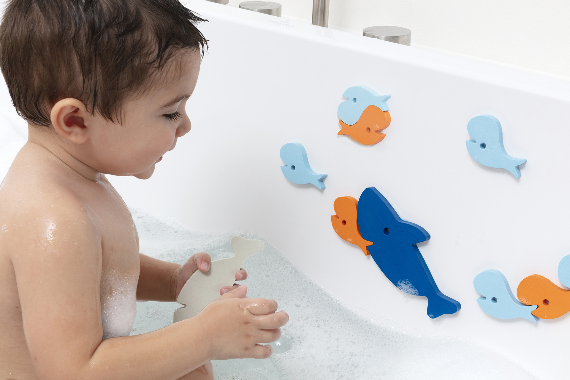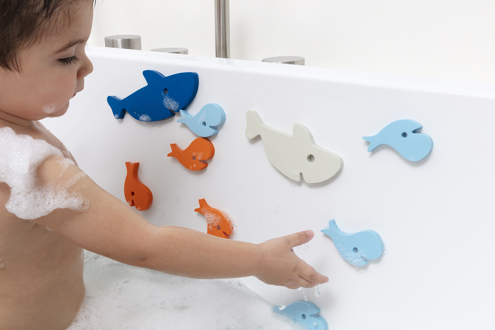 Met dit badspeelgoed een leuke badpuzzel haai, is in bad gaan nog nooit zo leuk geweest! Kleef de puzzelstukken tegen de badrand of in de douche en bouw zo een knappe 3D-puzzel. Creëer al puzzelend een prachtig badverhaal. Dit badspeelgoed uit EVA-schuim stimuleert het creatief spelen en de fijne motoriek. De puzzelstukken absorberen geen water, blijven drijven en vrij van schimmel.