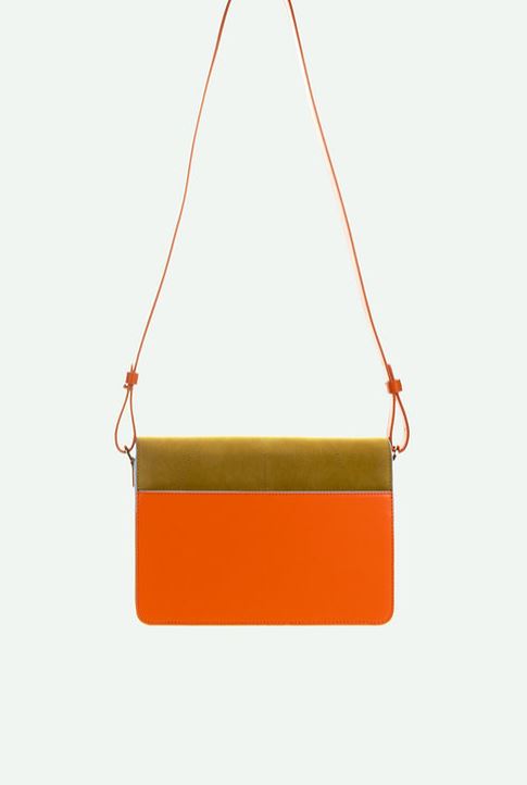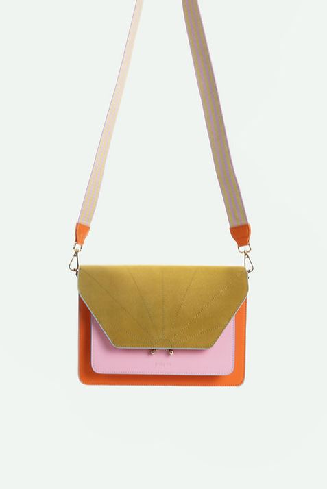 Een schooltas van arancia oranje + dolce roze + citroenblad met twee verschillende, afneembare handvatten: een verstelbare riem van veganistisch leer en een gestreepte riem van webbing. De tas is gemaakt van hoogwaardig vegan leer en heeft een vegan suède flap. De voering is gemaakt van stoer & chic gestreept canvas en de gouden rits aan de binnenkant is van YKK. De tas heeft één voorvak en twee compartimenten. Elke tas wordt geleverd in een stofzak, zodat je je tas kunt opbergen als je hem niet gebruikt.