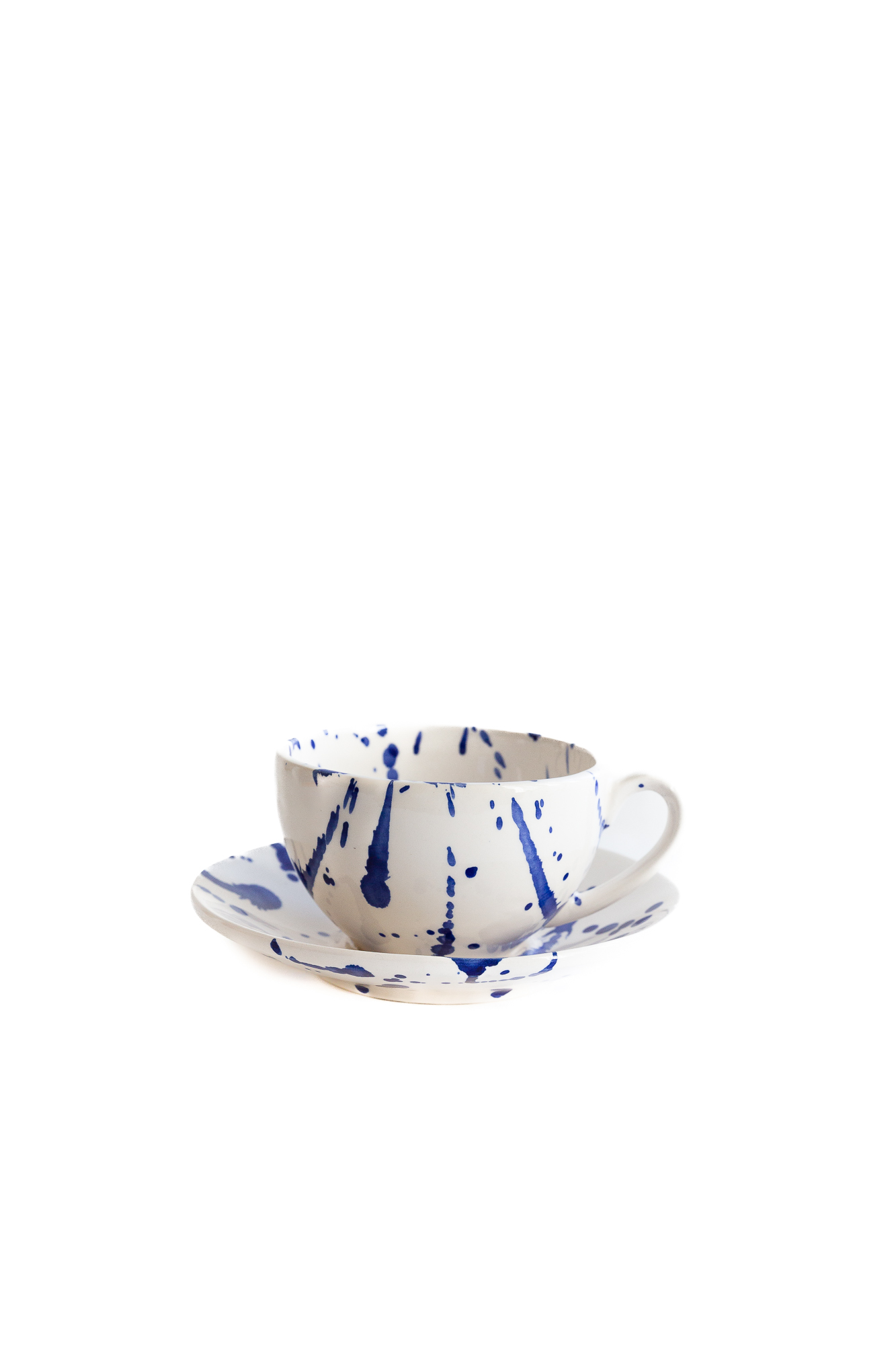 Productinformatie "Val Pottery Foolish Cappuccinotas Cosy 10x7.5 cm - Blue Blob - Handgemaakt Keramiek - met Schotel"