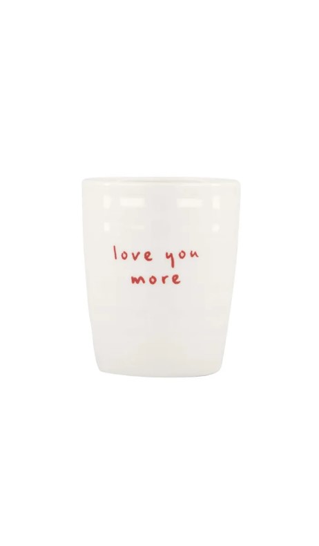 Dit espressokopje van Zusss is o-zo leuk! Op dit witte kopje staat in rode letters 'love you more'. Ook erg leuk om cadeau te doen! Het espressokopje is gemaakt van aardewerk, heeft een doorsnede van 6cm en is 7cm hoog.